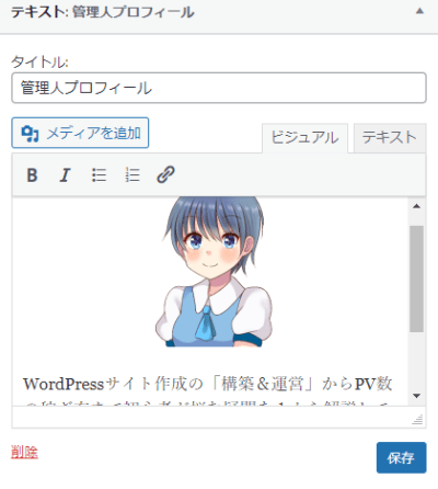 このサイドバーにおける「プロフィール」は、Wordpressで設定したプロフィール