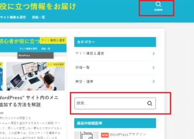 ▲私のサイトでは赤い枠の2箇所に検索欄を設置していますが、一番上の検索欄は